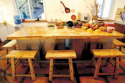 厨房里暖暖的味道亮相 秀场:温馨厨房 厨房里散发着暖暖的味道,正中间摆放着一张桌子,是用香杉木制作而成的,一共就200元,看起来很厚重,配上几把板凳,还真有点乡间田园的味道。桌子上有很多水果、蔬菜,闲暇时候,方青卓也会亲自下厨,她做的一手好菜,可是家里人一致公认的。橱柜的旁边,有一扇铝合金的门,打开一看,原来是将多余的空间做成几个格子,用来放锅、碗,空间一点也不浪费哦!