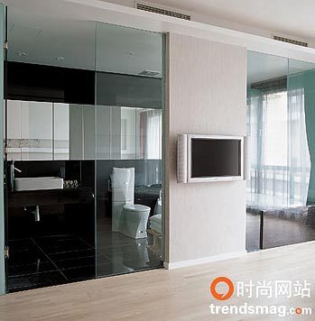 卫浴外的液晶电视 本是阳台的地方现今被打通成了客厅的一部分,可就在与地下室连接的这一小块地方硬是擦掉了原本的“实线”换上了透明玻璃做地板的“虚线”,从上而下或是从下而上观望,有种奇异的感觉,思想的角度不同,自然生活的角度也不同。而两把造型别致的红色椅子像一对艺术品一样摆在玻璃地面上,你可以从任何角度观赏它们,甚至可以仰视,那两把椅子更是欣赏性大于实用性。这也是一种生活态度。