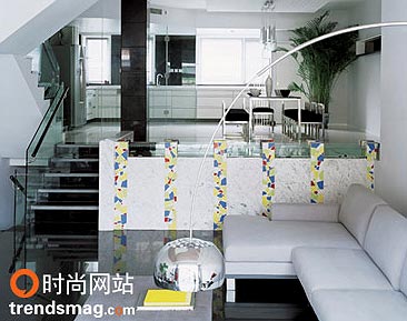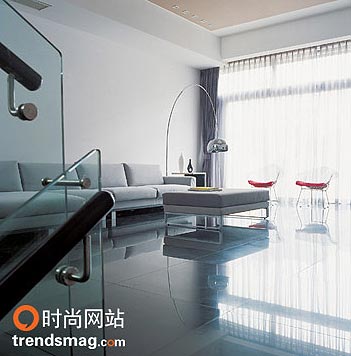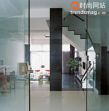 客厅 用色彩留痕 整套设计的另一个特别之处是它的色彩。没有那么多浪漫的颜色,纯粹的透明玻璃、纯粹的白和纯粹的黑,中间偶尔缀上一点红,然后是金属。这种色彩感觉在家中无处不在。餐厅里白色的地面衬着墙上的黑色块,黑色的椅面拼接着硬朗的金属腿;客厅里黑色的 大理石 地,白色的 沙发 ,透明的楼梯扶手;三层休息区对面的小型工作室虽然加入了红色的书柜,也是用银色和直 线条 装饰,空间里运动着的是干脆的色彩语言,直白有力,与主人的要求不谋而合。