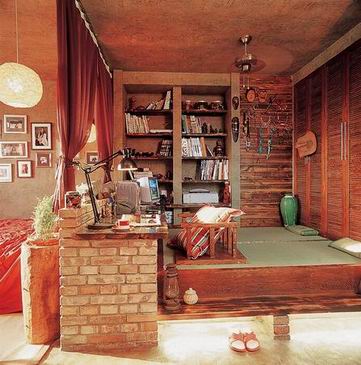 此空间既是一个书房,又是一个休闲区域,还可以客人来的时候当成客卧,背后是一个更衣柜,正面是书架和陈列柜,塌塌米的框架和书桌都是由普通的红砖垒成的,放上一把无腿的坐椅就是一个书房,仔细观察塌塌米的下部是有灯光的,不光是一种装饰,夜间的照明也可以满足。