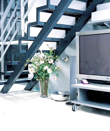 楼梯和电视柜之间的花,绝对是点睛之笔。如果没有这束花,三角空间小小的死角处,电器的机械感觉加上楼梯的钢铁冰冷,还有黑和灰的冷漠色调,少了一点家的味道。可以用花把这种小死角空间融会贯通。最好选择上接楼梯下接地面,色浅而亮眼的花,抹去空白,也抹去了距离——在心和环境之间。 |