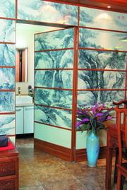 一画一世界 房间的结构很特殊,据说只是一个很大的一居室,里面的空间需要业主自己进行区域划分。一进门,正对着一扇玻璃 推拉门 ,将玄关与客厅巧妙分割,门口的右手边是用名贵 木材 制成的鞋柜与衣柜。为了打破颜色的滞重感,中心的柜体做成了壁龛的样式,看似随意摆放的青瓷花瓶凸显了家中的文化气息。旁边是一把仿旧圈椅,为主人换鞋提供方便。门口的左手是一通到底的镜面,一来可以照一下出门时的仪容,二来也可以产生空间变大的错觉。 推开玻璃门,里面真是别有洞天。一整面墙被一幅巨大的泼墨山水画所覆盖,说得确切点,这一面墙就是一幅画。“我喜欢中国的字画,不一定非是什么名家名作,闲暇时候看看,眼睛都觉得舒服。”张先生平时工作压力很大,借助这些淡雅脱俗的字画可以舒缓白天紧张的神经,“这是我的一个亲戚画的,完全按照我家墙的尺寸,然后由师傅精心地一小幅一小幅地裁下来,做好实木框架,嵌入画,再镶上水晶玻璃,然后再一幅幅地钉到墙上去。” 如此复杂的工艺造就了一面视觉效果令人叹为观止的美墙,更为巧妙的是,在画幅中心偏右的位置,居然隐藏了一扇门,不仔细看根本感觉不到它的存在,推开门就可以通到厨房和卫生间。 “纯粹中式的家具比较沉重,不太符合我们的年龄。但我们又希望自己的家不要太简单,以至于过几年就过时了。”陶小姐完全同意老公的装修理念。 于是,当我们走进他们的爱巢,迎面看到的是精雕细刻的中式纹样家具和摆设,但也不乏舒适享受的现代卧具,在家具与家具之间,形成了颜色、形式上的对比关系,一点不觉得老旧古板,反而充满和谐的生机。