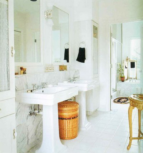 精品卫生间—身轻气爽 12款阳光般舒适惬意的卫生间,总能让你找回属于自我的生活空间。让我们一款一款来领略卫生间的文化吧。 一、柱式 洗手盆 虽然没有办法提供储存物品的空间,但由于其挺拔美观的造型风格而倍受推崇。 这浴室已有两个储物墙柜,配上简洁的柱式 洗手盆 极为适合。墙柜上部装玻璃门,增加了通透感,侧面向 洗手盆 斜开,既避免了方正呆板的形状,又能在 洗手盆 前顺畅地使用抽屉。 镜子下方的半幅墙则巧妙地遮掩了水管,并提供了摆放饰物的边沿。整个设计布局合理,整洁大方,如同窗外射入的阳光般舒适惬意。