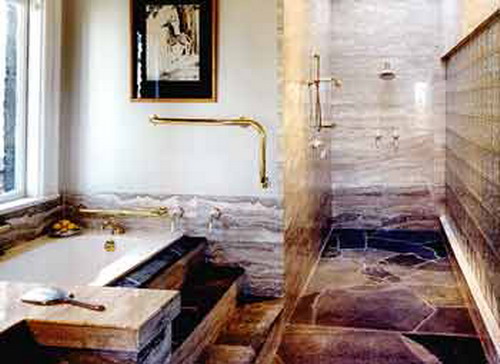 精品卫生间—山石情趣 十二、追求自然的表现手法真可谓千奇百怪:人家楞是把阿拉伯的山石放在了自己的浴室里。您会怎么看呢? |