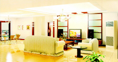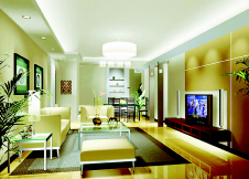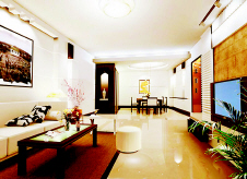 淡雅的色调,衬托出胡桃木的天然质感;直线的造型更显出 沙发 的柔软舒适,几件简单的家具,使宽大的客厅顿显生气。 花樟饰面的主题墙和餐厅处的装饰 隔断 ,表现了主人的高贵气质,吊顶和墙面的造型,细腻刻画出主人对品位的追求。