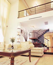 色调淡黄,在辉煌与明亮之间的金色,有一种尊贵之意。足够恢宏的空间,更能强化这种感觉:站在高远的穹顶下,一切就成为人的背景;空间越大,人作为空间重心的感觉就越强烈。 客厅中间的 沙发 体量很大,色近米黄,比地板略深而属同一色系。虽然没有繁复的雕饰,不过造型雍容,宽松大气,依然是很清晰的欧式风格,只是贯注了现代生活简洁明快的理念。中间地毯上的茶几,木质镶玻璃,桌脚进行了精细的雕琢,并在横边上装饰金边。整体看来轻盈简练,与 沙发 属同一谱系。 背后整面墙体都是一面落地窗。从顶部垂下来淡黄的 窗帘 ,分束两边,不厚重却是室外景观的帷幕。拉开后的阳光感极好,因此在两侧的装饰是一尊盆景和一束向日葵。另一束洁白的百合在 沙发 侧的茶几上,在这里看去,阳光、 窗帘 、向日葵,清贵而明媚。 沙发 后楼梯前,一尊根雕的茶桌,充满古朴野趣。一套功夫茶茶具摆在上面,无须有人就能想象到清茶一盏的悠然。两三好友对坐闲聊,窗外斜阳渐落,一个下午的时光溜走得不知不觉。 餐厅在楼梯另一侧,中间的 隔断 正好做陈列格。顺着它上去,上面的空间一边凭栏呼应客厅,一边贯通楼梯,距离穹顶的灯光更近而多了几分温暖之意。靠墙是中式的家具,相貌古雅,形态狭长,对面的茶几却是玻璃不锈钢。再加一座随意的 沙发 背栏而坐,简简单单却是一个人的闲适。 |