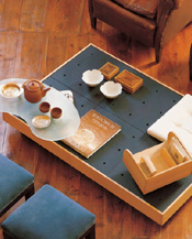 茶几最初的功能比较单一,最常放置的就是茶具,因此被称为“茶几”。在国外,人们习惯喝咖啡,也就把它称为“coffee-table ”。虽然,茶几在客厅中只是个小配角,但因为它却是非家庭成员拜访时,在客厅中喝茶聊天接触得最多的摆设,所以,茶几在家居“性格”的表现中扮演着不俗的角色。它往往能够塑造出多姿多彩、生动活泼的家居表情。传统上,茶几总是放置在客厅 沙发 前,但在现代家居中,茶几的位置是灵活多变的。 木质是茶几最为传统的选材,金属、玻璃、塑料,皮革及 其它 合成材料也逐渐被接纳并被应用到日益丰富的家居环境中去。 一人独处的风景