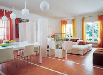| 说是扇子般的屏风可不是指屏风“长”得像扇子,而是它可以像扇子一样开合。它是由一种柔软打褶的无纺布材料制成的,除了可以制造出私密的角落效果外,其气泡结构还可以吸收室内噪音。如果买不到一模一样的成品,我们有很多方法可以替代它:在相对的两面墙上打孔,中间拉上绳子并在上面挂上帘子,帘子的图案颜色可以根据个人喜好选择;或者使用一个可收缩的木制长棍,上面装饰照片或画片,也别有新意。