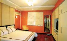 公司:北京创意未来装饰公司莱雅精品工作室(图六) 设计:周见石 电话:66517936—8013 精致的白色枕套和床垫体现出典雅的气质,红色的背景墙上点缀着几幅鲜花的图案,黑色的床架和床头柜将古朴沉稳的特质带入居室。 |