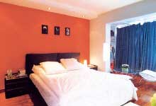 设计施工:北京鸿扬家装公司(图四) 电话:64801088 与其他卧室不同的是,主卧大胆地运用了红色墙纸,与白色简单的陈设给人一种简洁现代、温馨浪漫的情结。