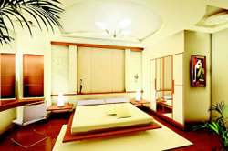 公司:创意未来装饰公司 (图1) 设计师利用简洁的直线勾勒与单纯的色块对比,抒发出居室的现代感,素色墙面与重色地板形成了卧室稳重大方的主基调。柔美的弧线天花造型在空中自由伸展,曲线与直线的和谐搭配丰富了室内设计元素。