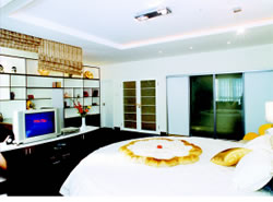 设计施工:鸿扬装饰公司 (图2) 当更衣室、卫生间被规整地隐藏在两道玻璃门后;依墙而做, 线条 简洁、大气的展示柜勾勒出了卧室的主题,营造着另一种居室文化。