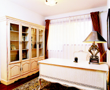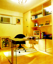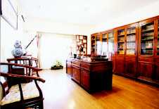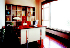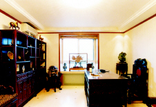 9平方米的书房,只可容下一桌、一椅、一柜,顶面和窗户成为设计师体现书房品位的装饰重点。直 线条 造型的花板既达到了装饰效果又不妨碍自然采光。顶部中间的正方形吊廊与整体格局形成90度角,使书房多了一分精致,突出了书房的中式韵味。