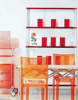 初夏的风里,还有最后一丝温柔的感觉。接踵而来的,将是热浪、骄阳、冷气和冰淇淋……你准备好了吗?今年的夏天你要去哪里找清凉----海滨、山里,还是夏威夷豪华旅? 或者,挑选一些清凉通透的家具,舒舒服服躲在家里,拉上百叶窗拒绝大太阳,再来杯冰水透心凉……这样开始夏日,舒爽之极。 橘红色的透明坐椅将结构的美感完美呈现,它轻巧、棱角分明,绚丽的色泽与通透质感能带来夏日清凉的最佳感受。如果摆放上同样清透的书柜,再来一张轻便的小桌子,夏日书房已全部就绪,可以坐下来,写点心情了…… |