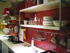 5搁物架的空间排列 厨房操作台上面的空间也该好好利用,当吊柜有碰头之嫌的时候,搁物架就可以大显身手了,把所有瓶瓶罐罐的小东西尽揽怀中,碗碟刀叉也不在话下,规整出一个拿放方便自如的空间,必不可少。 6移动空间 一个可以自由移动的物品架会给你带来许多方便,做饭的时候呼来放在身边,不用的时候收起来放到隐蔽处,给厨房增加一个漂流的小空间。 |