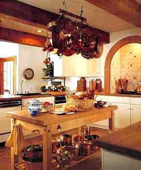 这个厨房之所以取得了修葺一新的惊人效果,其原因无非在于:让白色的墙壁和贮藏柜轮番跟大量的 木材 居于主导地位。袒露的横梁与宽宽的松木地板遥相呼应,拱形装置和工作台面之间夹着仿砧板“孤岛”,伊然是一对心心相印的“伙伴”。最后的点睛之笔,要数一系列耀耀生辉的紫铜锅碗瓢盆,从中折射出了房间自身的影子。 笔者注:考虑到防火的因素,此类厨房在防火材料的选择上可千万不能马虎,否则后果不堪设想。 |