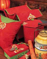 将大红色的烛台摆上餐桌,将五彩丝的配饰挂上椅背,还有色彩艳丽的绢花、香包、民俗摆件,物品虽小,却能起到画龙点睛的作用。 |