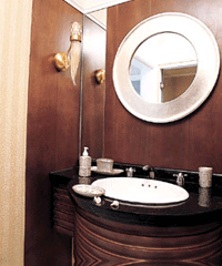 | 稳重中式的卫浴风格 适合人群:喜爱中国传统文化或中老年人可以选择这种风格,设计成熟稳重,适合于选用中国传统家具的家庭。 整体风格:选用了中国传统家具中多见的黑色为主色调,整体效果沉稳大气。双人面盆使用起来舒适而不拥堵。因为空间较大,所以使用了浴缸,与主人的身份也很相符。整个设计中,墙面以竖 线条 为主,这样使人感觉层高增加,扩大了卫生间纵向的空间感。 值得借鉴的地方:浴缸的一面墙改为装饰墙,里面安放了一些插花,使卫生间里保持自然的气息,可以从卫生间外面随时更换插花,很有创意也非常方便。