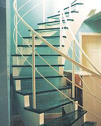楼梯主要有受力的曲梁、踏步、扶手及栏杆组成的,聪明的设计师将这些主要构件有机地连接起来,互相受力设计出各种优美的造型。如木制的旋转梯,每步踏步板的受力在两端。一力点在中间柱体上,另一力点是在盘龙的扶手上,上下力点整体后达到受力及护围两个目的。木制直角形楼梯,踏步板受力在中间的一根斜梁上,而稳定踏步板的力一头传递在墙体上,而另一头的力侧传递在扶手上。图为漂亮的玻璃踏板楼梯及其多变的弧形梯,它主要受力在曲梁上,而栏杆则起到护栏和装饰的作用。有些楼梯将踏步悬吊在上面的横梁上,还有一种单梁悬臂踏板楼梯则是将力传递在上下横梁上,这些楼梯设计均是造型和力学优化组合的典范。 ![]() |