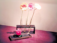 金属质地的圈椅,小巧的桌几上金属鹿形的烛台,让人惑然于是古是今,而墙面上的装饰更具特色,是在两片塑料中加入了天然麻。在玄关处摆放椅子是处于方便换鞋的考虑。 |