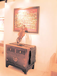 这是个原本就很中式的玄关,暴出参差漆皮的两屉橱兼具储物功能。女主人陈小姐把下面的两门柜中间加个一层隔板,这样就实现了玄关的原始用途——换鞋。玄关柜上面的摆设异常简单,暗绿色的桌旗,似象似羊的木雕饰物粗朴有力,最值钱的装饰应该是那幅出自名家的抽象画了,价值数万元。