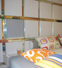 这里的最大特色是错层,让整个空间多了一些灵动。步上客厅与餐厅交界处的三级楼梯,便到了主人家休息和学习的宁静空间。书房的布置简单时尚却很实用,最吸引人的是挂在墙上的布艺装饰画,将整个空间衬托得高雅起来。一进小孩房,便知道什么是童真的世界,可爱的叮当猫、米奇等小玩具多么逗人,多彩的玻璃装饰让整个房间都动起来了。 在简约的主人房里,花式的床上用品加上多彩的布艺靠垫,简直是最完美的搭配,把时尚的玻璃床头背景设计也比下去了。在这里,每一个空间都利用得很好,还设计了时尚的卫浴间和衣帽间。 |