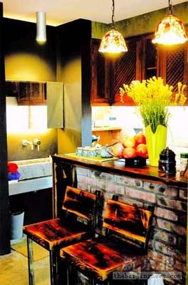 从厨房到厅堂有堵一米多高的墙,铺上木板它就是吧台和饭桌。