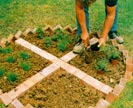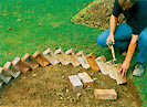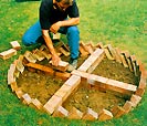 用砖在花园里摆造型, 步骤1.在自家庭院的草坪上先画一个圆圈,再在中间画一个十字架,然后把圆圈中间的土挖掉十公分厚左右。 步骤2.把长方形的方砖按顺序,依角度摆放在圆圈的周围。 步骤3.在圆圈中间的十字形上,依次平放上两层砖头。 步骤4.在砖的空隙处填满泥土,可以填得松软些。 步骤5.在泥土中,栽上一盆盆的小花,尽量把花盆栽在泥土里。 步骤6.工作完成,在方砖砌成的造型中是一朵朵即将盛开的小花。