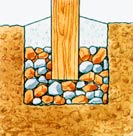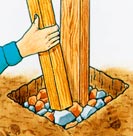 “五一”节就要到了,准备居家过节的人们是否该在自家的院子里施展一下身手,做点小设计呢?DIY虽说不算新,却很少有人真正动手享受其间的欢乐,不妨利用一下这个长假,一方面放松神经,另一方面也可以让已经绿意葱葱的庭院有些新的生机。 创意1、做个结实的木架子 在院子里搭架子是个很简单的活儿, 步骤1.先在庭院中挖个深坑。 步骤2.把一根粗木头放在坑中,用两根细木条支住它,使它站直。