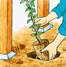 步骤3.在坑里粗木头的周围填上小碎石头,在木头的下部也要填上,防止木头打滑。 步骤4.在小碎石和地面之间的缝隙中浇上少量的水泥。 步骤5.在木桩子的边上种上一棵小树。 图为:绿意葱葱的庭院 |