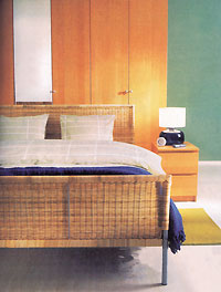 木制、藤制卧室家具质朴而舒适 卧室最佳色彩搭配:表现木制、藤制格调 淡绿色的墙壁被柔和的灯光衬托得更加神秘,一排原木质地的储衣柜简单而幽雅,尤其是搭配上别致的藤制双人床,就好像夏天的清风已经溢满整个房间。再来一块土黄色脚垫,色彩的和谐扩大了视线,整个房间变得更加明亮。 至于床上用品,可以多准备一些彩色的被褥。无论是玫红色还是海蓝色,条纹图案或是印花装饰,都是不错的选择。 而在原木橱柜的前面摆放同质地同色系的床头柜时,别忘加一盏晶莹的白色床灯,它的光线会让整个房间更加清新。一个深色的双人床更能突出木制家具的别致,又为房间增添了醒目的一角,如果在床上铺一条粉色的褥毯,一床素色小格子的被子,那么,房间顿时有了生机。 在配饰方面,不妨在卧室的墙上挂上颜色亮丽的画框,会增添更多的艺术气氛和享受。 儿童房最佳色彩搭配:主打绿色 绿色是春天的色彩,也代表着生命力和大自然。儿童房可以多采用绿色来装扮。小床、小桌、小凳、小储物柜都可以采用绿色或邻近色。在此色调的房间中,后期配饰也可采用表现大自然的物件。比如,使用印制许多可爱蚂蚁的被罩;放一件树叶状的装饰物;摆一个蛇状的布艺玩具。