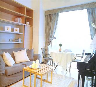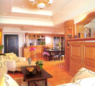 全案采开放式处理,因此可以发现客、餐厅及吧台间三者间的息息相关,客厅以樱桃木温馨包覆,仿壁炉式的隐藏式电视柜外型优雅,柜体后方装上玻璃,视线可以直接可以直接进出书房。 成年人围坐在一起,话题多是理性的。 在进入私密空间的同时,设计一内玄关做为与公共空间的区分,地材的圆型拼花与天花的造型相互辉映,融洽而适雅。 主卧部分一旁铺述休闲区,亦利用角落规置出梳妆区,机能性完整。