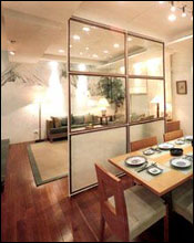 然而,使空间变大的作法中,除了空间的重复利用之外,设计师在本案里运用到视觉上的重复利用。一楼的客厅、餐厅、书房和厨房之间,皆以玻璃做隔间。不同于水泥墙的绝对阻断于闭塞感,透明材质的运用,能让视觉穿透各个空间,达到个空间互相借景的效果。