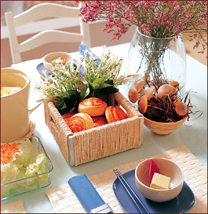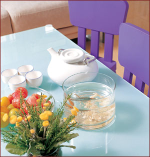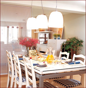 主人喜欢白色,喜欢清亮通透,于是,李智以餐桌的宽度为参照,用飘逸的白纱帘做虚的 隔断 ,把客厅和餐厅区分开来,让空间若隐若现,既不会进门就一览无余;坐在客厅看餐厅,也不会觉得很杂乱。为了不让纱帘感觉过于轻飘,将纱帘的上下端用木杆固定,并在纱帘上做了几枝假花装饰。同时纱帘可以很方便地摘取,换洗非常方便。