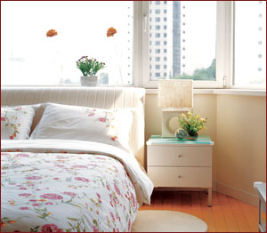 南向的主卧室有弧形玻璃窗,采光极好。为了不辜负这一优势,主人干脆将床头紧挨窗户摆放,可以晒着太阳睡觉,一点都不浪费阳光。