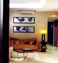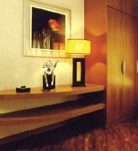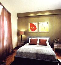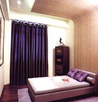 主卧室的空间设计简洁大方,每一处都别具匠心。床头板比床的尺寸大得多,巧妙地嵌入墙体,隐于其他的藏光带映出几片淡淡的光晕,铺陈出安宁、静谧的夜晚。床头板旁边的墙体上,安装了一块半圆的小弧形台面,用来放置女主人简单的日用品。除了两个造型简洁的床头柜,主卧内再没有任何多余的家具,然而,室内的气氛并不因之而显得空洞苍白。床头板上细密的织布纹理,暖暖的棉质床上用品,柔软的天鹅绒衬垫,丝绸枕头,还有华丽的双层 窗帘 ,无处不漾溢着浓浓的暖意和罗曼蒂克的气息。 第二卧室的立面 线条 简洁概括,蕴含着东方风格的神韵。最突出的特点是几何元素的运用:覆以缎面的床头板上,排列着等距离的长方块;深色的地毯上,用对比色印着抢眼的圆形图案,延展着人的视线;两幅形分意的水彩画,方正的挂于床前,透出主人含蓄平和的东方情怀。最富设计意味的选择是两个波浪型的床头柜,柜体因均匀起伏的曲线而产生优雅的律动。