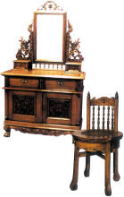 这种梳妆台兼顾到居室、家具的陈设,有的表面看是一块遮覆板面,梳妆使用时将面板打开,就成了一个带镜子的化妆台。有的梳妆台镜面是暴露在外固定的,化妆台面如抽屉一样可以向外拉出,化妆品放在薄型抽屉里,设置在化妆台面上方,比化妆台面窄小,形成梯状,方便实用。不化妆时,这里就是一个书桌或工作台。 既有传统造型,又有现代功能的梳妆台也有一定的市场?