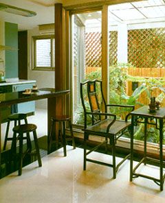 与自然同步呼吸的庭院造景 值得一提的是颇费设计师巧思的一、二、楼庭园造景。在满是水泥建筑的都市,想要求得一小块绿意景观,相信是很多人的衷心期盼,这个家的屋后是日式废弃建筑,空地上长满浓密的绿色植物,顺应这难得的条件,设计师利用花格砖砌成一、二楼庭园与邻户的区隔元素,一来具有视觉的穿透感,同时又可达到屋主对居家环境的安全讲究。而为蚊虫的干扰,外罩纱网,上面用采光罩为庭院引进充足的自然 光源 ,使得这一小块绿地充满盎然生机,饲养些鸟只,也不怕有笼中鸟的拘束感。 采光罩的交错 线条 ,透过落地窗反映,让餐厅地坪呈现一幅清灵的几何画面。静谧的夜晚,在竹叶林间啜饮一壶好茶,相信足以忘记一日的尘嚣。
