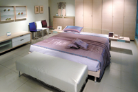 这是一款现代气息浓重的双人床,延伸出来的床体可用做床头柜,而床罩则加入了些许中式元素,淡紫色的薄沙令整张床充满浪漫的气息。