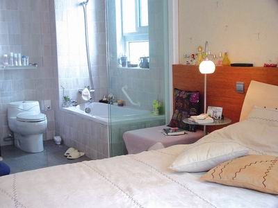 图四,卧室-浴室 李先生买这套错层房的时候还真犹豫了一段时间,房地产市场对“错层”房型议论纷纷,让李先生把握不准,其中最令人担心的问题是“错层”房型是否抗七级地震,好在有关专家的介绍给他吃了颗定心丸,“错层”房型只要在楼板的连接处作好抗震的技术处理,完全是可以达到七级防震的技术指标。李先生还有个作设计师的朋友,装潢自然也就省心多了。 人们传统的居住习俗正逐渐受到新潮理念的强烈挑战,旧式的居住观念已被迅速发展的现代都市生活理念所替代,很多朋友都和我说过,从床上一脚就能跨到浴缸里,这种自在的空间和惬意的感觉只有单身者才能享受。不过在这里这个理论被打破了。由于原先卧室面积不大,而主卫和客卫挨着靠在卧室外,主卫的门几乎正冲着他们摆床的位置,他们觉得有些别扭,于是将卧室门打掉,齐着主卫靠外侧的一边打出卧室的门,这样等于形成了近似正方形的一大间卧室,而且还把主卫包在了卧房中;但如果仍然保留主卫的外墙,卧室照旧会显得局促,于是一个大胆的创意——做一个通体透明的卫生间就产生了。睡眠区域与洗浴区域相连,中间是清澈的玻璃 隔断 ,形成了浪漫氛围。卫浴间在家庭居室中是很私密的区域,它和人的联系最为直接,可以说最“人性”的一面都会在这里体现。它的通体透明,说明主人活得真实,坦诚,无所遮拦……