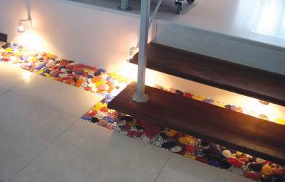 图五,彩色鹅卵石 错层房屋的另一个特点是丰富了居家生活的画面层次,许多人在买房装修时,特意在房间内做个踏步,设计个平台,目的是要改变传统固有的生活空间,以享受美满的立体生活,设计师在这个看似小的细节上可谓动足了脑筋。简单的两节踏板,简洁实用,符合人体趋前的生理结构,既轻松拾级,又形成明显的居住功能。脚底下五彩缤纷的鹅卵石在灯光的照射下,为平淡的设计增添了不少的光彩。