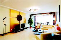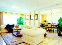 (图六)客厅与餐厅,从墙面、顶面、地面和门窗套的黄白暖色,到 窗帘 、灯饰家具的深黄主色的配合,显现了工整与和谐,感觉温暖舒适,让人体会到生活的乐趣,从现代生活的角度重新演绎了古典风格。