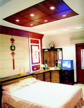 (图二)卧室选用细腻精致的古典家具,天花板为弧形吊顶,体现出传统装饰在现代人生活中仍然有重要的地位,它所蕴涵的民族文化是任何装饰所替代不了的。