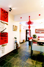 (图三)地面使用天然石材,与中国传统装饰吻合,墙面的装饰也采用了书法、木雕等手法,整个空间和谐稳重。