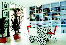 整个空间设计简洁实用,总体色调以黑白为主,在其中点缀绿色、红色,既统一也不显得单调。展示架陈设没有采取常规的手段,设计师运用“阵列”的方式来扩大储物空间,主人收藏之物尽展眼前。 |
