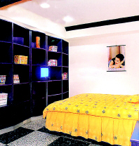 卧室:设计师用色更为大胆,装饰元素使用上最为简捷。黄色床罩让空间形成色彩上的跳跃,深紫色展示柜让空间变得沉稳和安宁,而粉色墙面形成色彩上的连接和过渡,让空间充满温馨和浪漫。