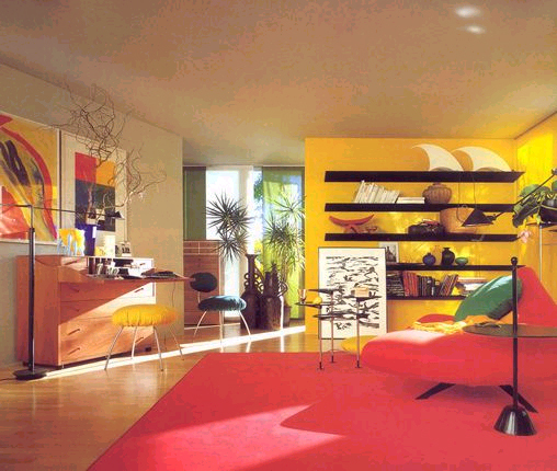 红色的地毯,黄色的墙面,红、黄两色的绘画作品,强烈的色彩冲击,形成橙黄的色调,给人温暖的感觉,而经过黄色 窗帘 过滤的阳光,更给室内带来些许的暖意。绿色的靠垫、绿叶的植物,点缀其中…… |
