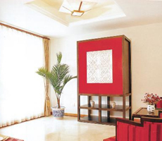 开篇浓墨重彩之中 红色,素来都是被中国人认为是最吉祥、隆重的颜色。在面积约七八平方米的门厅中,红色的优势被充分地突现出来。中式贴银雕花的小柜辅以具有魔幻条纹的 沙发 使得传统与现代在这个小空间中完美融合。加之黑木框架和装饰条有节奏地配合,门厅无疑是向来客敞开热情、奔放的胸怀。 客厅较好地体现别墅采光良好的优势,高大的落地窗让主人毫无后顾之忧。在这个前提条件下,客厅采用了一般居室中较少运用的紫色。在延续中式风格的基础上,客厅主体配置中性的白色 沙发 ,与此同时,又分别在客厅一角摆放了色彩厚重的深紫色休闲 沙发 , 沙发 靠垫色彩次之,以突出层次感。条纹大胆、奔放的墨绿色地毯显然与 沙发 形成良好的互补色彩关系。 在呼吸与波动中推进 餐厅与厨房位于一层空间的另一端,可以说,它们与客厅是一种平静的关系。但是,在这里,色彩的推进上显然是放慢了脚步。餐桌椅在色彩的选择上体现一种内敛含蓄的美,稳重的棕色材质加上镂空椅背使之颇得人缘。整体厨房已经不为人们陌生,但如何更好地体现它以人为本的特性呢﹖在色彩上,厨房采用让人放松身心的白色,并配合不易造成眼部疲劳的米色人造石台面。 上到二楼空间,色彩的重心又重新回到激烈的主题上。楼梯正对的空间为一套书房和茶室合二为一的开放式空间。虽然属于公共空间,但在色彩的设计上依然主次分明。阅读区的墙面处理非常有趣。为避免过多重复和大面积地使用红色,设计师只做了小面积的红色背板的开敞式书架,贯穿整体的主框架则选择黑 木材 质。迂回的造型为奔放的色彩平添几分细致。顶面的处理也体现出设计师的一丝不苟,呼应书架造型的顶面造型可谓一举两得。地面的红色条纹地毯使现代的节奏感得以再现。 小茶室做得则简单一些,很好体现主次关系。日式的榻榻米和纸灯、竹帘完全体现天然的本色。