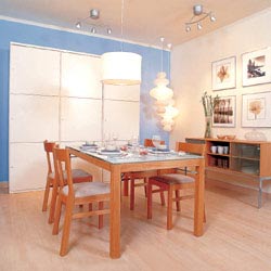 图为:餐厅使用橡木色餐桌,这是目前国际上流行的颜色。 客厅最佳色彩搭配:对比色要明显 客厅中的双人布艺 沙发 可以更换不同颜色的罩套,如果选用的颜色,与周围环境的主色调反差较大,则能够达到事半功倍的效果。这个法则同样适用其他家具、布艺、配饰的搭配。比如,木质色咖啡桌配上亮黄色的矮凳。再如,将彩色格纹的靠背垫,玫瑰红与白色相间,黄色与蓝色相间,随意摆在蓝色 沙发 上。又如,在木制搁物架上放一排白色的储物箱……这些搭配都恰到好处。