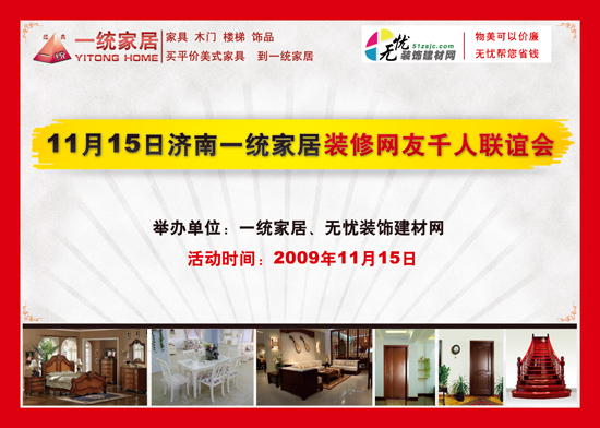核心提示:济南一统家居携手无忧装饰建材网,11月15号装修网友千人联谊会。